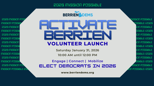 Get involved and make a difference for all in this community. Berrien needs you to elect leaders that will fight for equity, fight for every person, fight for Democracy. Join the Berrien County Democratic Party on January 31st from 10:00 AM to 12:00 PM for our 2026 Activate Berrien: Volunteer Launch.