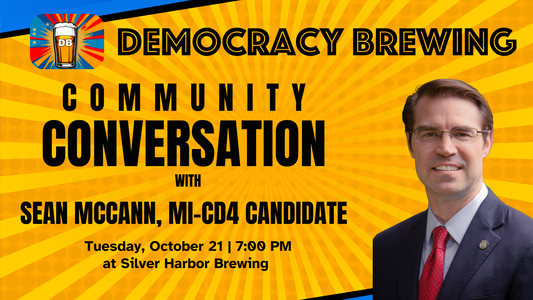 Democracy Brewing Community Events welcomes State Senator Sean McCann for a frank and honest community conversation on Tuesday, October 21st, 2025, as he campaigns for Michigan's 4th Congressional District with a message focused on kitchen-table issues that matter most to Southwest Michigan families.
