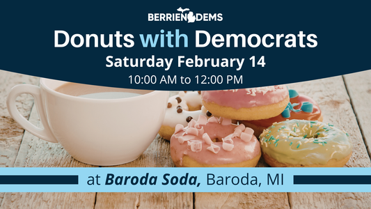 Start your Saturday with coffee, donuts, and great conversation. Join the Berrien County Democratic Party (BCDP) for Donuts with Democrats—a relaxed, welcoming space to connect with like-minded neighbors who care deeply about our community and our democracy. We’ll meet on Saturday, February 14, from 10:00 AM to Noon at Baroda Soda (8918 1st Street, Baroda, MI).