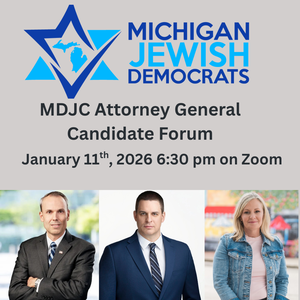 Join MDJC on 1/11/25 from 6:30 pm-8:00 pm to have a virtual meet and greet with Michigan Attorney General Candidates: Oakland County Prosecutor Karen MacDonald, Washtenaw County Prosecutor Eli Savit, and former US Attorney Mark Totten. Hear them weigh in on the issues and why they should get your vote at the MDP nominating convention in April