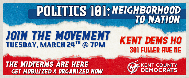 Have you ever wanted to know how elections are actually won? This is your chance! The Kent Dems are excited to host Politics 101: Neighborhood to Nation on Tuesday, March 24th at 7:00pm.