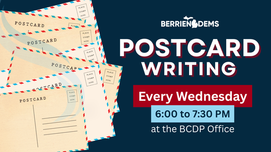 Starting Wednesday, April 1, join the Berrien County Democratic Party every Wednesday from 6:00–7:30 PM for Postcard Writing Wednesdays and turn action into impact.