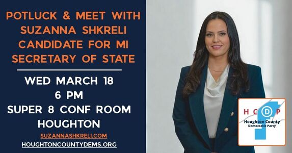 Join the Houghton County Democrats for a potluck social hour and a chance to meet with Secretary of State candidate Suzanna Shkreli.